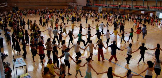 Biodanza works with carefully scripted sequences of dance connections to selected music. A class of 100 or so plays with eyes open or closed, following instructions in exploring partners, shifting from solos to any combination up to the whole floor in a weaving, circle dance. Biodanza was conceived and developed by a Chilean anthropologist, and is a world-wide movement and a deliberate training curriculum.